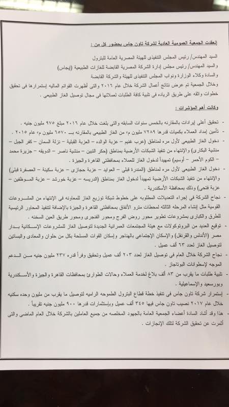 عقدت شركة تاون جاس والتى يترأس مجلس إداراتها المهندس ياسر بهنس ، الجمعية العمومية العادية ، بحضور المهندس عابد عز الرجال الرئيس التنفيذى للهيئة العامة للبترول والمهندس أسامة البقلى رئيس الشركة القابضة للغازات الطبيعية ايجاس، وعدد من قيادات القطاع والمعنين.