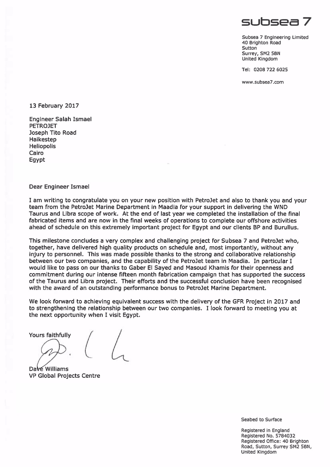واختتم الخطاب بتطلع شركة subsea7 الى تحقيق المزيد من النجاح لشركة بتروجت خلال تنفيذ المرحلة القادمة GFR خلال عام 2017 والعمل على تقوية العلاقات المشتركة القائمة بين الشركتين مع الاشارة الى رغبة فى عقد اجتماع مشترك مع قيادات شركة بتروجت خلال أول زيارة له الى مصر خلال الفترة القادمة.