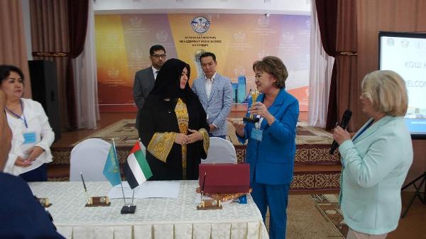وقعت مصممة الأزياء العالمية الأماراتية مني المنصوري بروتوكول تعاون مع كليتى الإدارة والأعمال والتأهيل المهنى والخدمات في مدينه استانا بحضور محمد أحمد بن سلطان الجابر سفير الأمارات بكازاخستان وحاكم استانا وعدد من المسؤولين وسيدات الاعمال والمجتمع بكازخستان وسط أستقبال من طلبة وطالبات الكلية بباقة من الورود من خلال تقديم عرض أزياء تراثي وتاريخي يسرد تاريخ كازاخستان