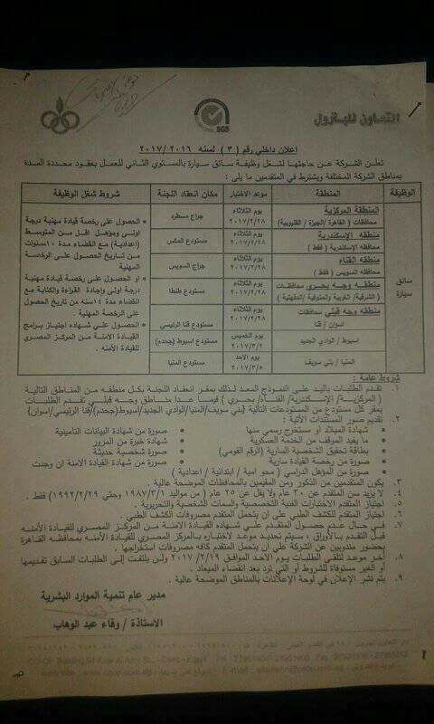 تعلن شركه التعاون للبترول عن حاجتها لشغل وظائف سائق سياره بالمستوى الثاني للعمل بعقود محدده السنه بمناطق الشركه المختلفه