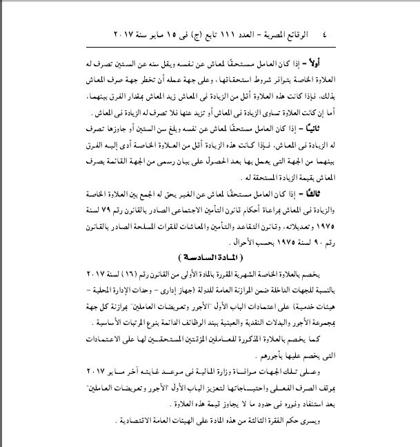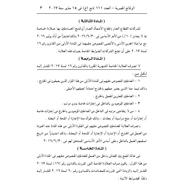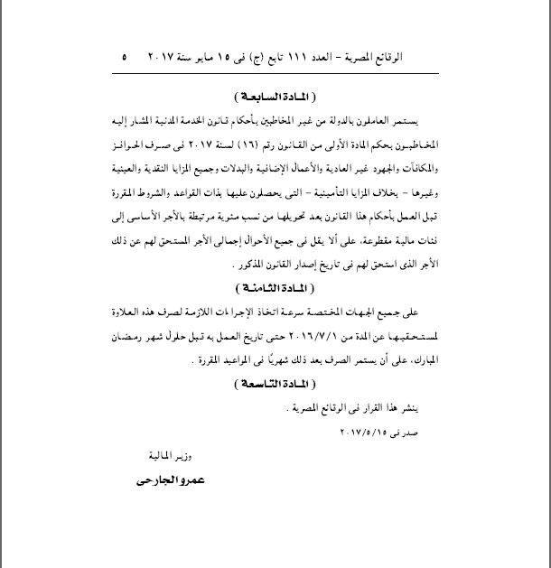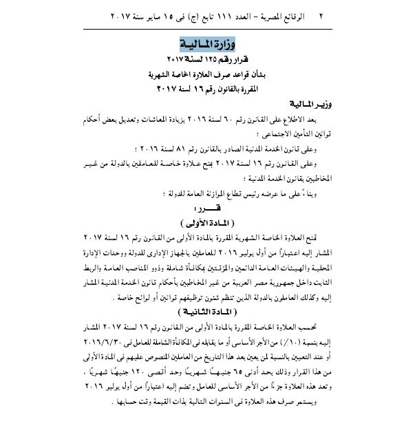 نشرت الجريدة الرسمية قرارا لوزير المالية عمرو الجارحى، بشأن قواعد صرف العلاوة الخاصة الشهرية المقررة بالقانون رقم 16 لسنة 2017، وجاءت كالتالى: