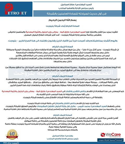فى أول حديث له، بعد توليه منصب رئاسة مجلس الإدارة والعضو المنتدب لشركة بتروجت، قال المهندس صلاح اسماعيل، فى رسالة له نشرتها الصفحة الرسمية للشركة على الفيس بوك”، أنه يتقدم بالشكر إلى المهندس طارق الملا – معالى وزير البترول والثروة المعدنية، وإلى قيادات الشركة، وعلى رأسهم المهندس محمد شيمى – وكيل أول وزارة البترول لشئون المشروعات والرئيس السابق لشركة بتروجت وإلى النص الكامل لكلمته: