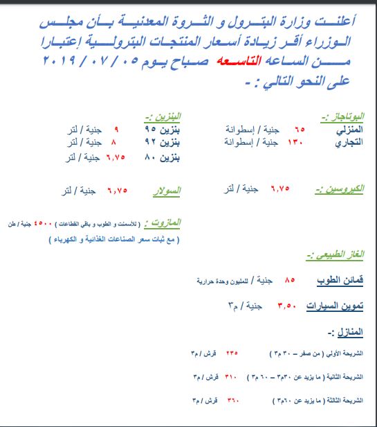 أعلنت وزارة البترول والثروة المعدنية بأن مجلس الوزراء أقر زيادة أسعار المنتجات البترولية اعتبارا من الساعة التاسعة صباح يوم 5 / يوليو/2019 على النحو التالى: