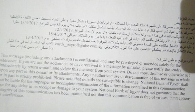 ونوه البنك الأهلى، إلى أنه يمكن للشركات إرسال ملفات المرتبات، حتى يوم الأربعاء 12أبريل، مطالبا بعدم تحميل أى ملفات مرتبات تستحق يوم 13 أبريل.