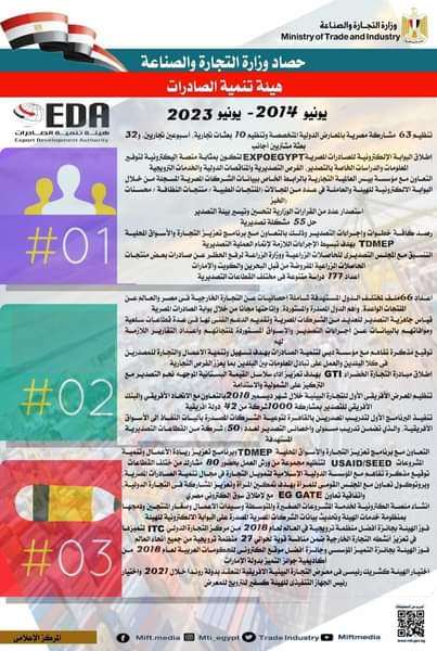 – إطلاق البوابة الإلكترونية للصادرات المصرية EXPOEGYPT لتكون بمثابة منصة إليكترونية لتوفير المعلومات والدراسات الخاصة بالتصدير، الفرص التصديرية والمناقصات الدولية والخدمات الترويجية.