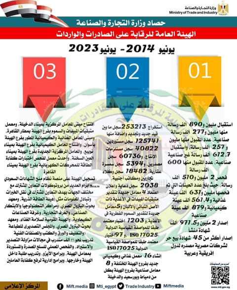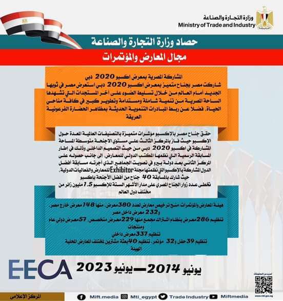 – تنظيم 63 مشاركة مصرية بالمعارض الدولية المتخصصة وتنظيم 10 بعثات تجارية، أسبوعين تجاريين، و32 بعثة مشتريين أجانب.