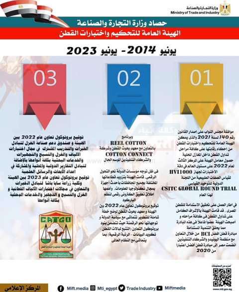 – موافقة مجلس النواب على إصدار القانون رقم 140 لسنة 2021 والذي يمكن الهيئة العامة للتحكيم واختبارات القطن من إحكام رقابتها على كافة مراحل تداول القطن داخل المغازل المحلية.