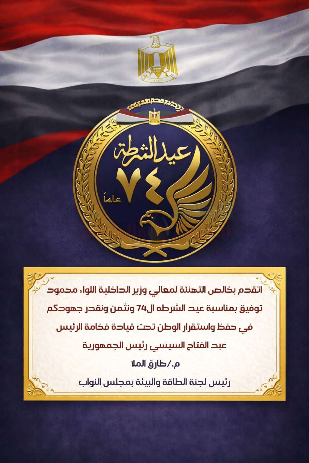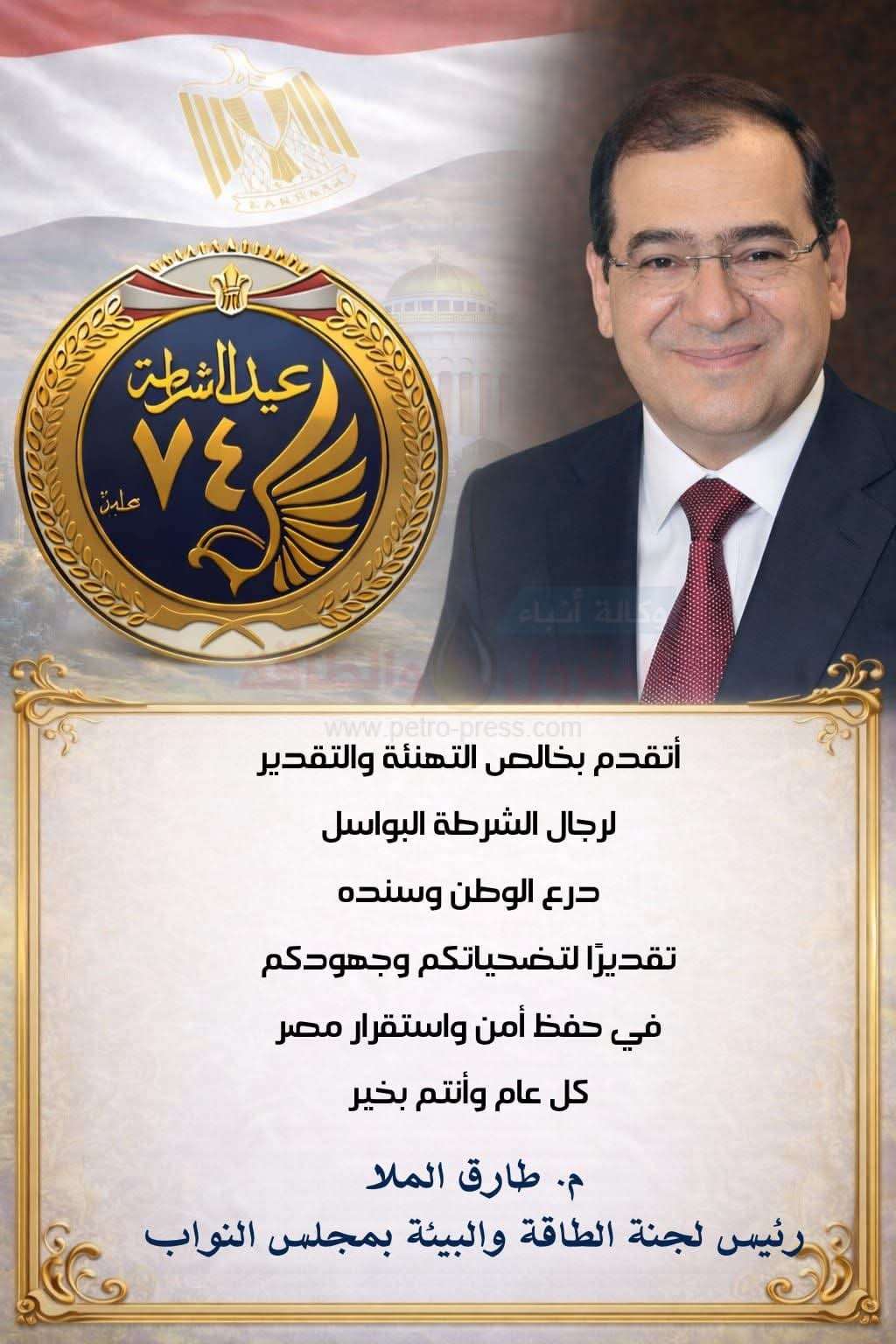 كتب رأفت إبراهيم…تقدم النائب طارق الملا، رئيس لجنة الطاقة والبيئة بمجلس النواب، بخالص التهنئة والتقدير إلى رجال الشرطة البواسل، وذلك بمناسبة الاحتفال بعيد الشرطة الـ74، مشيدًا بتضحياتهم وجهودهم المتواصلة في حماية الوطن والحفاظ على أمنه واستقراره.