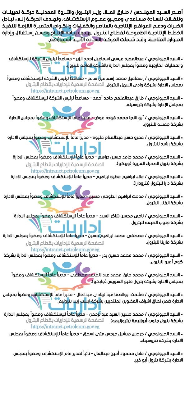 أصدر المهندس / طارق الملا، وزير البترول والثروة المعدنية حركة تعيينات وتنقلات للسادة مديرو عموم العمليات، لكل من شركة جمسه للبترول والحمرا أويل وقد شملت الحركة السيدين الآتي اسمائهما: