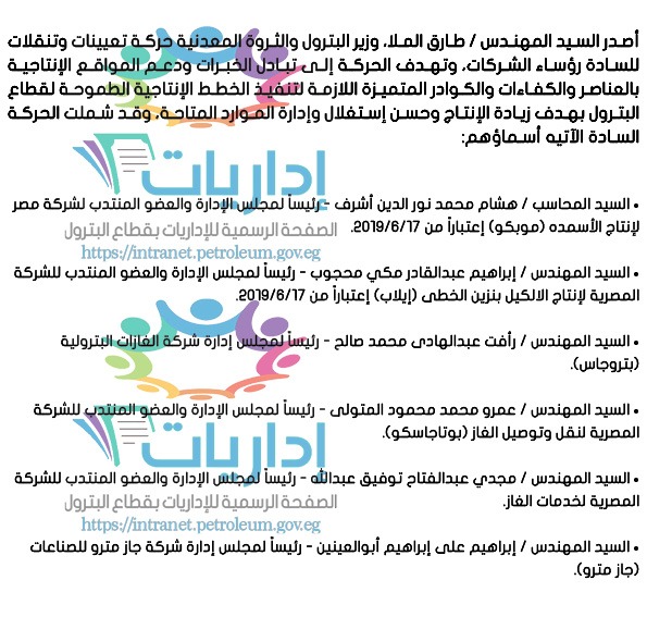 أصدر المهندس / طارق الملا، وزير البترول والثروة المعدنية قراراً بتكليف المهندس / محمد محمود زكى محمد – نائباً لرئيس الشركة للعمليات وعضواً بمجلس الإدارة بالشركة المصرية القابضة للبتروكيماويات (إيكم).