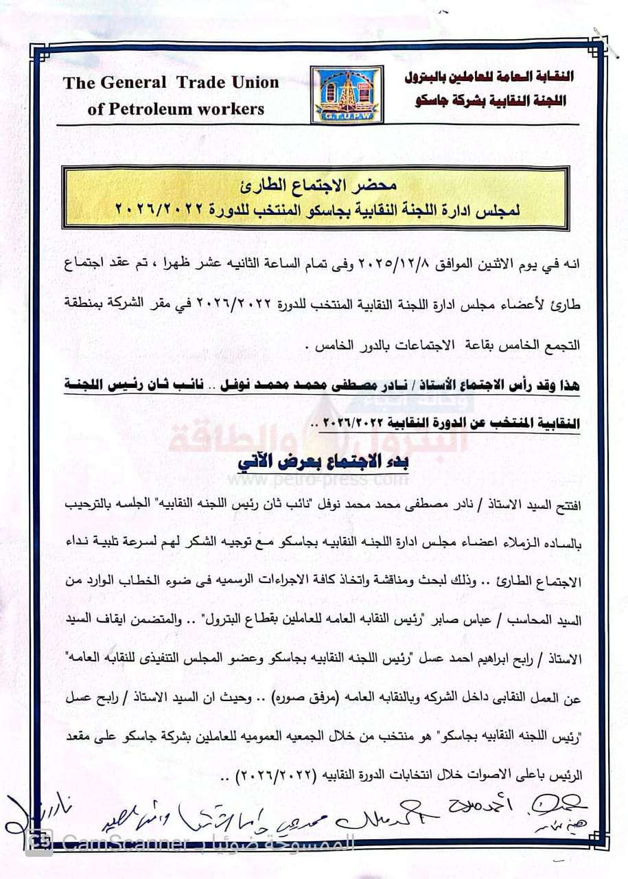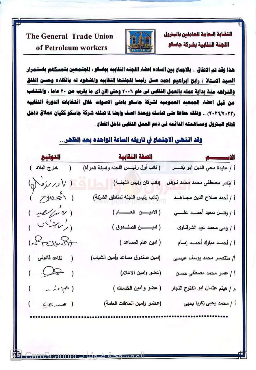 هذا وقد تم الاتفاق .. بالاجماع بين السادة اعضاء اللجنه النقابيه بجاسكو ، المجتمعين بتمسكهم باستمرار السيد الاستاذ / رابح ابراهيم احمد عسل رئيسا للجنتها النقابيه والمشهود له بالكفاءة وحسن الخلق والنزاهة منذ بداية عمله بالعمل النقابي في عام ۲۰۰٦ وحتى الان اى ما يقرب من ٢٠ عاما ، والمنتخب من قبل اعضاء الجمعية العمومية لشركة جاسكو باعلى الاصوات خلال انتخابات الدورة النقابيه (٢٠٢٦/٢٠٢٢) .. وذلك حفاظا على تماسك ووحدة الصف وايضا لما تمثله شركة جاسكو ككيان عملاق داخل قطاع البترول ومساهمته الدائمه في دعم العمل النقابي داخل القطاع .