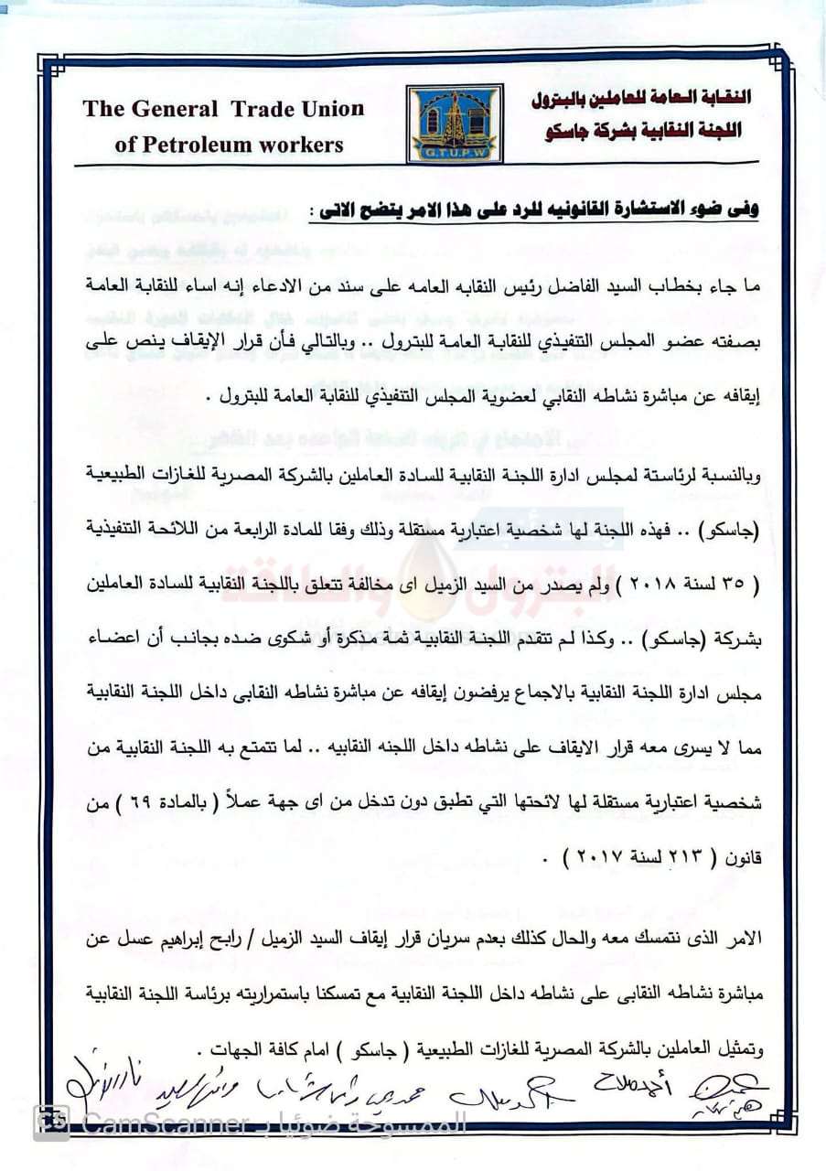 وبالنسبة لرئاستة لمجلس ادارة اللجنة النقابية للسادة العاملين بالشركة المصرية للغازات الطبيعية (جاسكو ) .. فهذه اللجنة لها شخصية اعتبارية مستقلة وذلك وفقا للمادة الرابعة من اللائحة التنفيذية ( ٣٥ لسنة ۲۰۱۸ ) ولم يصدر من السيد الزميل اى مخالفة تتعلق باللجنة النقابية للسادة العاملين بشركة جاسكو ) .. وكذا لم تتقدم اللجنة النقابية ثمة مذكرة أو شكوى ضده بجانب أن اعضاء مجلس ادارة اللجنة النقابية بالاجماع يرفضون إيقافه عن مباشرة نشاطه النقابي داخل اللجنة النقابية مما لا يسرى معه قرار الايقاف على نشاطه داخل اللجنه النقابيه .. لما تتمتع به اللجنة النقابية من شخصية اعتبارية مستقلة لها لائحتها التي تطبق دون تدخل من أى جهة عملاً ( بالمادة ٦٩ ) من قانون ( ۲۱۳ لسنة ۲۰۱۷ )