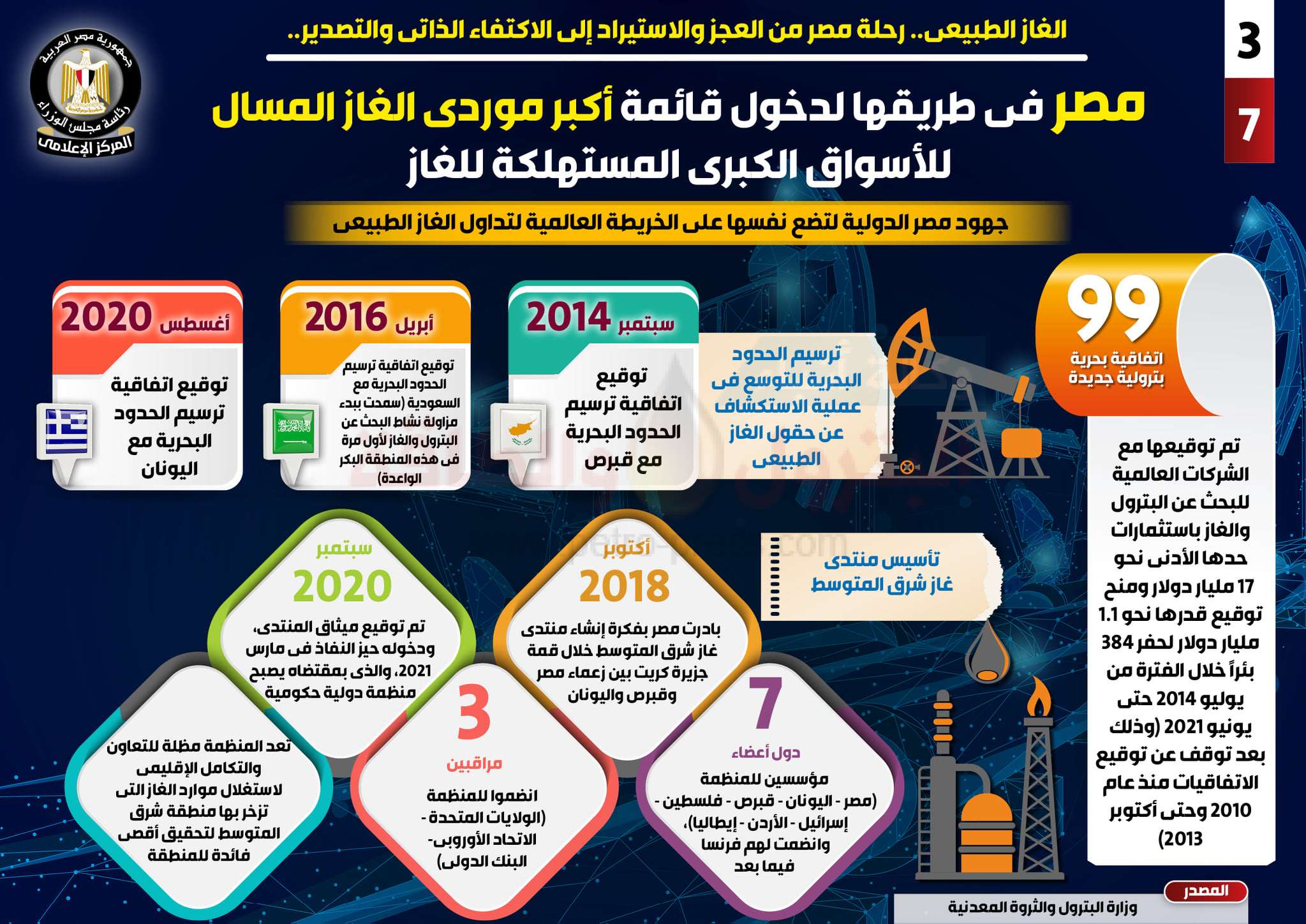 هذا وقد استعرض التقرير جهود مصر الدولية لتضع نفسها على الخريطة العالمية لتداول الغاز الطبيعي، حيث تم توقيع 99 اتفاقية بحرية بترولية جديدة مع الشركات العالمية للبحث عن البترول والغاز باستثمارات بلغ حدها الأدنى نحو 17 مليار دولار، ومنح توقيع تقدر بنحو 1.1 مليار دولار لحفر 384 بئراً خلال الفترة من يوليو 2014 حتى يونيو 2021، وذلك بعد التوقف عن توقيع الاتفاقيات منذ عام 2010 وحتى أكتوبر 2013.