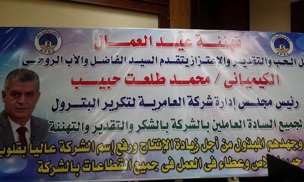 أقامت اليوم شركة العامرية للبترول ولاول مرة تحت رعاية الكيميائى محمد طلعت حبيب رئيس مجلس الادارة حفل كبير بمناسبة الاحتفال بعيد العمال