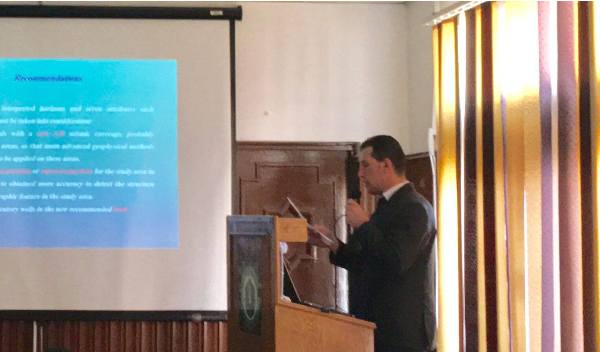 وتحدث الباحث عن التعريف بالاستكشاف الزلزالي والمراحل المختلفة له من حيث تجميع البيانات ثم معالجتها ثم عمل التفسيرات اللازمة.