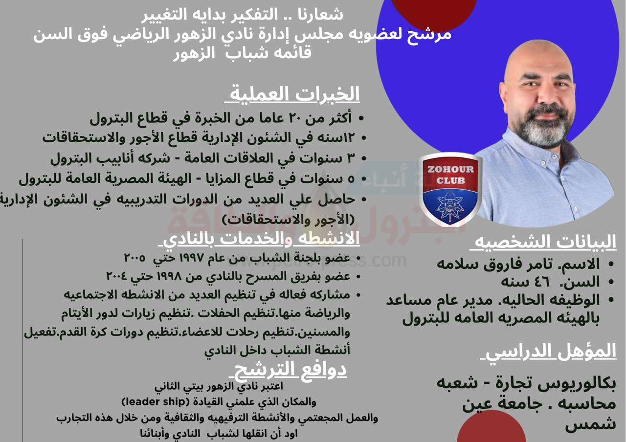 تامر فاروق ابن قطاع البترول يخوض انتخابات نادى الزهور الرياضى