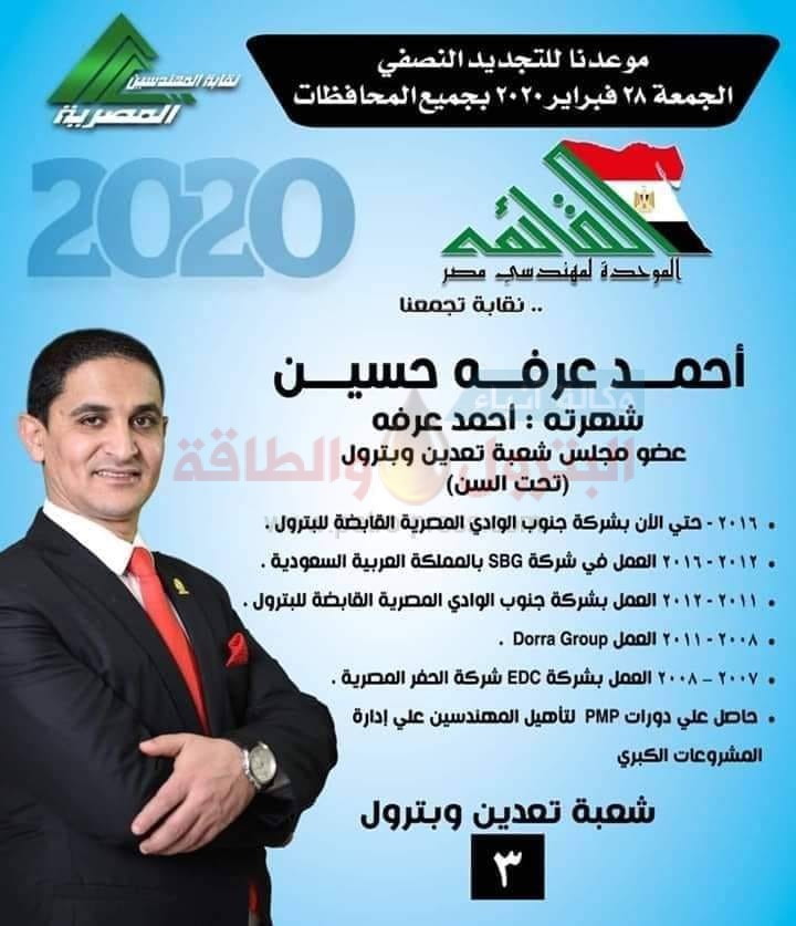 تنشر وكالة أنباء البترول والطاقة السيرة الذاتية للمهندس أحمد عرفة مرشح عضوية شعبة البترول والتعدين بنقابة المهندسين.