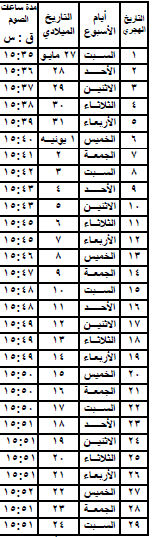 ووفقا للحسابات، سيكون يوم الخميس 27 رمضان، الموافق 22 يونيو المقبل، أطول أيام شهر رمضان من حيث عدد ساعات الصيام، بواقع 15 ساعة و52 دقيقة.