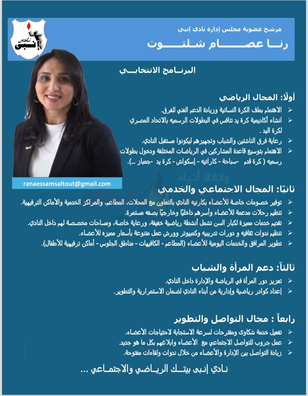 “جيل جديد..بفكر جديد..يصنع الإنجاز”..رنـــا عصــــــــام شـلتــــــوت مرشح عضوية مجلس إدارة نادي إنبي
