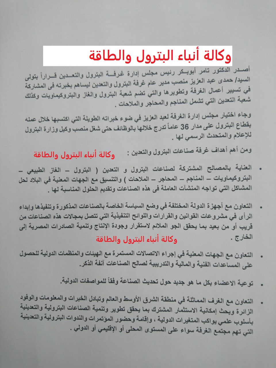 أصدر الدكتور تامر أبو بكر رئيس مجلس إدارة غرفة البترول والتعدين قرارا بتولى حمدى عبد العزيز متحدث البترول السابق ، منصب مدير عام غرفة البترول والتعدين ليساهم بخبرته فى المشاركة فى تسيير أعمال الغرفة وتطويرها والتى تضم غرفة البترول والغاز والبتروكيماويات وكذلك شعبة التعدين التى تشمل المناجم والمحاجر والملاحات .