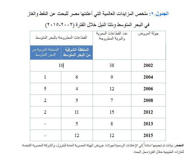 كما شهدت الفترة (2002-2015) نشاطاً مكثفاً في طرح المزايدات العالمية للبحث عن النفط والغاز في منطقة المتوسط ودلتا النيل كما هو مبين بالجدول-2، والتي لاقت إقبالاً واضحاً من شركات البترول العالمية مثل BP و ENI وغيرهم، وعلى إثر ذلك، حصلت عدة شركات عالمية على حقوق الامتياز في عدة قطاعات بحرية، ونجحت في تحقيق اكتشافات ساهمت في تحقيق قفزة كبيرة لقطاع الغاز الطبيعي في مصر، وهو الأمر الذي كان له انعكاسا واضحا على مسار التنمية في مصر.