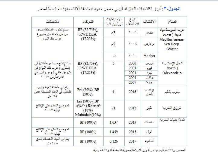 الجدول-3: أبرز اكتشافات الغاز الطبيعي ضمن حدود المنطقة الاقتصادية الخالصة لمصر