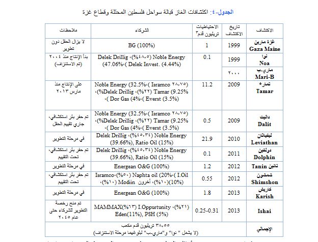 الجدول-4: اكتشافات الغاز قبالة سواحل فلسطين المحتلة وقطاع غزة