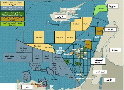 الشكل-3: القطاعات البحرية التي تجرى بها عمليات البحث والاستكشاف في شرق المتوسط،