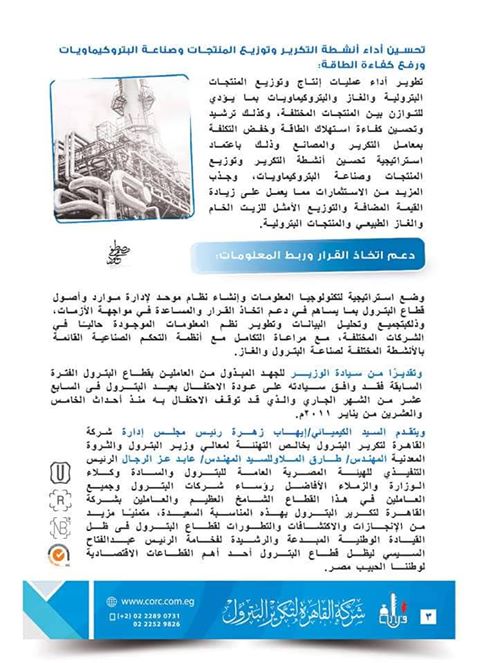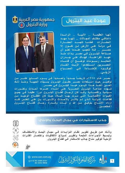 ويتقدم السيد الكيميـــائي/ إيهـــاب زهـــرة رئيس مجلــس إدارة شركة القاهرة لتكرير البترول بخالص التهنئـــة لمعالي وزير البترول والثروة المعدنية المهندس/ طـــارق المــــلا وللســيد المهندس/ عابد عز الرجال الرئيس التنفيـــذي للهيئــــة المصـــرية العامـــة للبتــــرول والســـادة وكـــلاء الوزارة والزملاء الأفاضـــل رؤســـاء شـــركات البتــــرول وجميــع العــاملين في هذا القطــاع الشـــامخ العظيـــم والعــاملين بشـــركة القاهـــرة لتكـــرير البتــــرول بهـــذه المناســـبة السعيــــدة، متمنيـًا مزيـــد من الإنجـــازات والاكتشـــافات والتطـــورات لقطــــاع البتــــرول فى ظـــل القيـــادة الوطنيــــة المبــــدعة والرشـــيدة لفخـــامة الرئيس عبــــدالفتاح الســــيسي ليظـــل قطـــاع البتـــرول أحـــد أهم القطـــاعات الاقتصـــادية لوطننـــا الحبيب مصر.