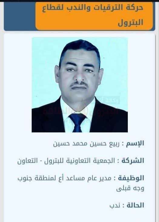 يتقدم الكاتب الصحفى رأفت إبراهيم واسرة تحرير وكالة أنباء البترول والطاقة والمحرر والمندوب الرسمى لوزارة البترول’ بخالص التهنئة القلبية إلى السيد ربيع حسين محمد بمناسبة ترقيته مدير عام مساعد أ ع لمنطقة جنوب وجه قبلى بشركة التعاون للبترول ، متمنيين له دوام النجاح والترقى.