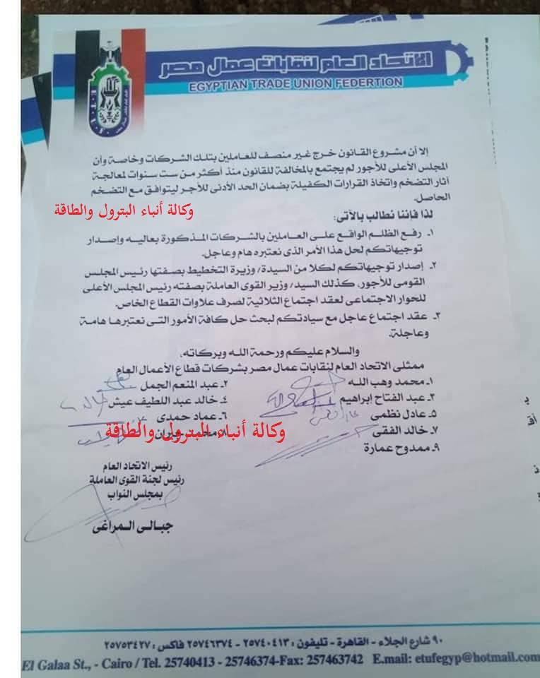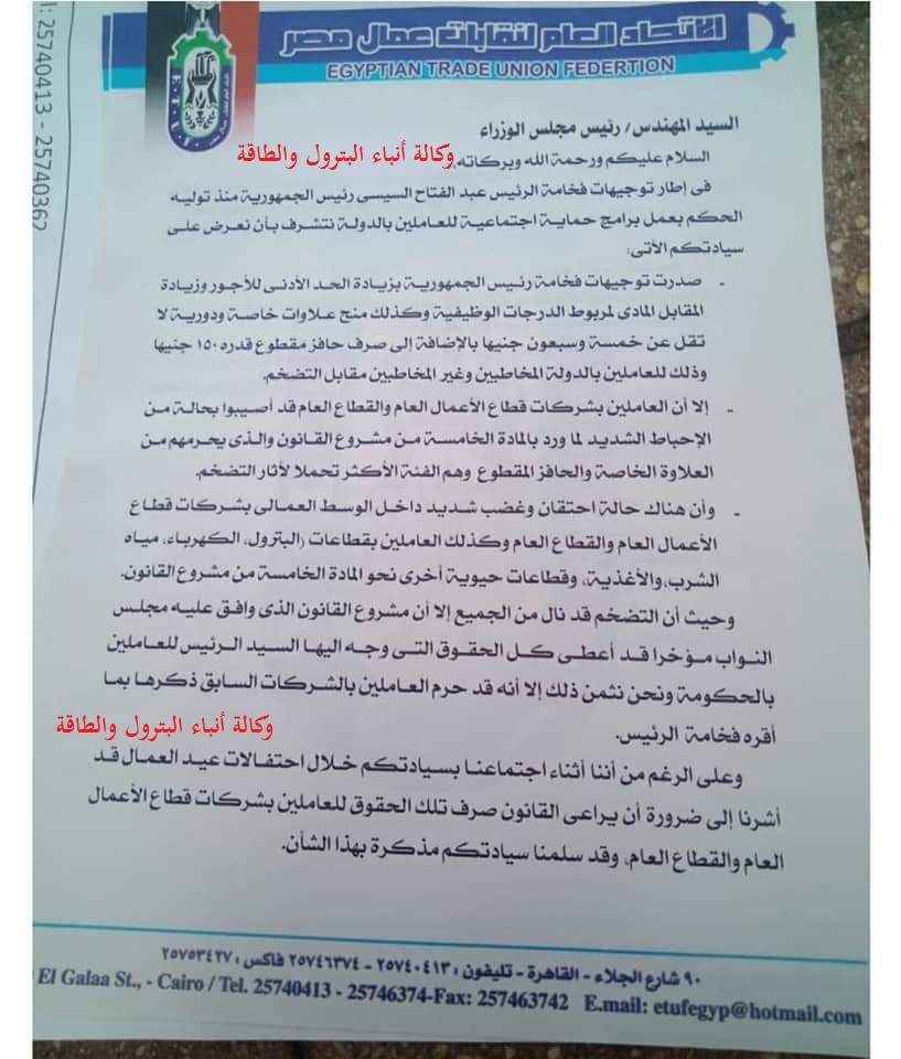 المذكرة التي وقع عليها قيادات الإتحاد العام لنقابات عمال مصر ،طالبت رئيس مجلس الوزراء بالتدخل العاجل برفع الظلم الواقع علي العاملين بشركات قطاع الاعمال العام المتمثل في حرمان العاملين من المزايا التي وجه بها السيد الرئيس عبدالفتاح السيسي، بزيادة الحد الادني للاجور وزيادة المقابل المادي لمربوط الدرجات الوظيفية،ومنح علاوات خاصة ودورية لا تقل عن ٧٥ جنيها بالاضافة الي صرف حافز مقطوع قدره ١٥٠ جنيها، وذلك للعاملين بالدولة للمخاطبين وغير المخاطبين مقابل التضخم.