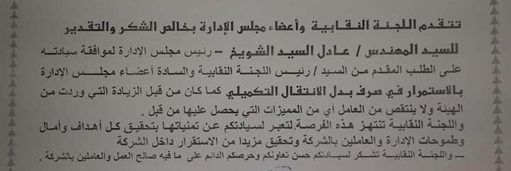 حصلت وكالة أنباء البترول والطاقة على منشور متداول ، بشكر وتقدير من اللجنة النقابية بشركة بتروجاس لرئيس شركة بتروجاس المهندس عادل الشويخ، لموافقته على استمرار صرف بدل الانتقال التكميلى ، كما كان من قبل الزيادة التى وردت من الهيئة ولاينتقص من العامل اى من المميزات التى يحصل عليها من قبل