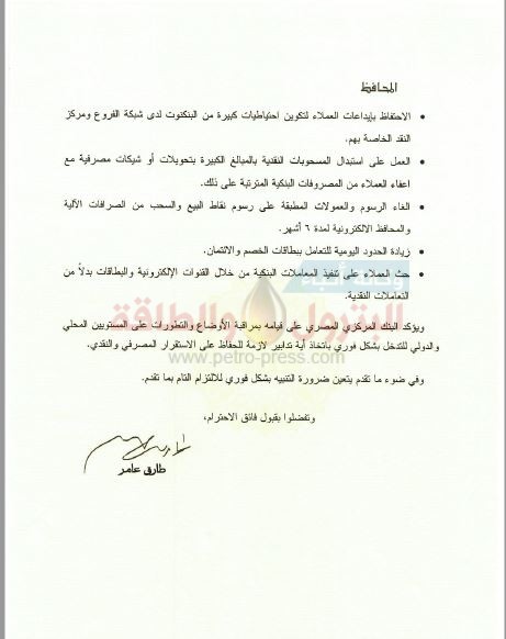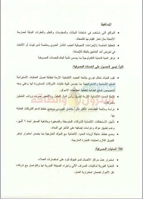 وأكد البنك المركزى فى تعليمات  إلغاء الرسوم والعمولات المطبقة على رسوم نقاط البيع والسحب من الصرافات الآلية والمحافظ الإلكترونية لمدة 6 أشهر، وإتاحة الحدود الإئتمانية اللازمة لتمويل رأس المال العامل وبالأخص صرف رواتب العاملين بالشركات، ودراسة ومتابعة القطاعات الأكثر تأثرا بانتشار الفيروس ووضع خطط لدعم الشركات العاملة بها، وتأجيل الاستحقاقات الائتمانية للشركات المتوسطة والصغيرة والمتناهية لمدة 6 أشهر ، وعدم تطبيق عوائد وغرامات إضافية على التأخر فى السداد، ووضع خطط عاجلة لزيادة الحدود الائتمانية مع البنوك الخارجية بما يضمن استمرار توفير التمويل اللازم لعمليات التجارة الخارجية.