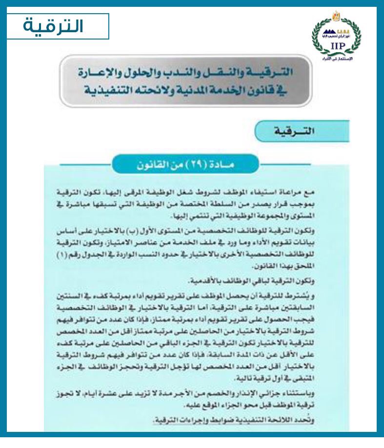 نشر مركز معلومات مجلس الوزراء، شرحا مفصلا لباب الترقية والنقل والندب والحلول والإعارة فى قانون الخدمة المدنية ولائحته التنفيذية – أغسطس 2017 – بالتنسيق مع الجهاز المركزى للتنظيم والإدارة.