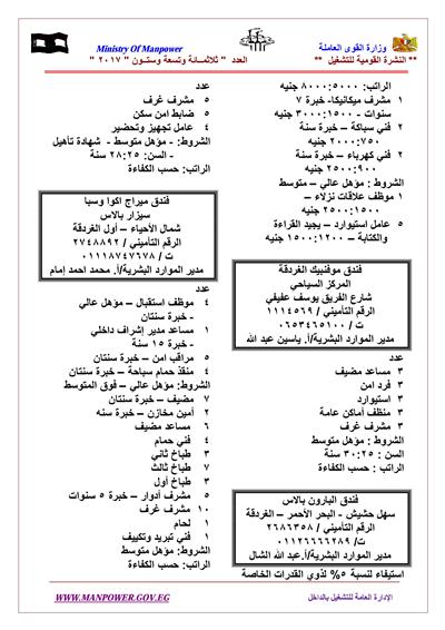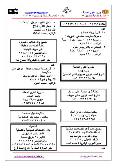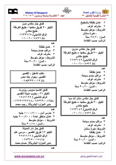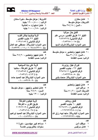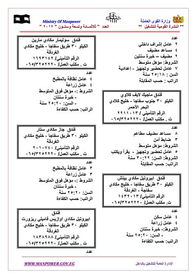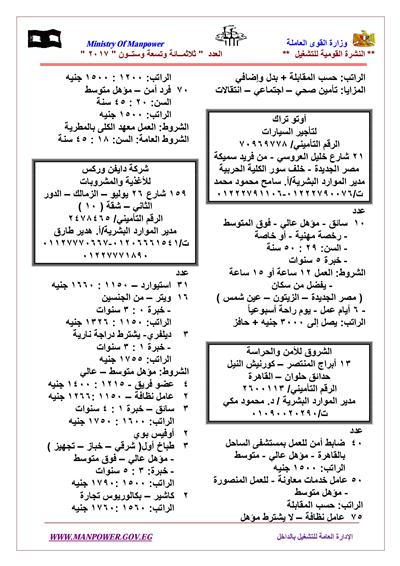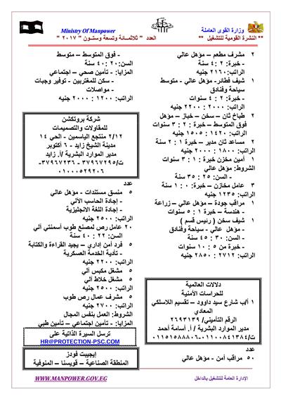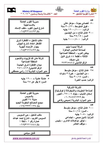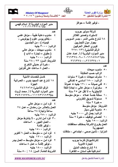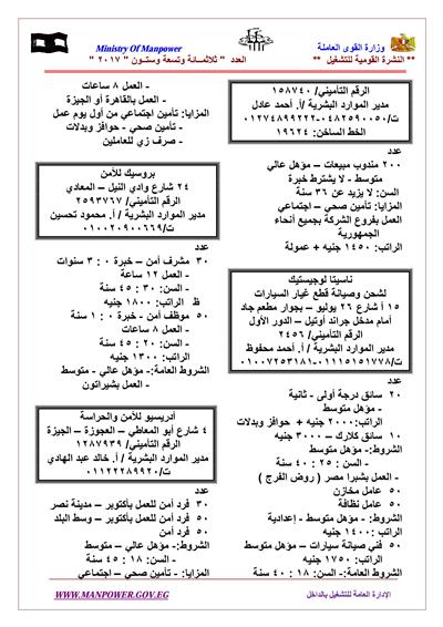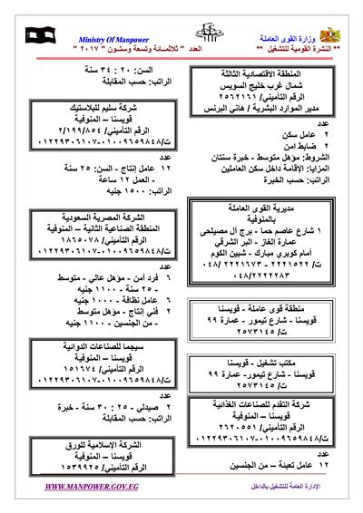 ننشر قائمة كاملة بـ “3315” فرصة عمل متوفرة خلال شهر فبراير الجارى، وذلك وفقا للنشرة القومية للتشغيل لوزارة القوى العاملة .