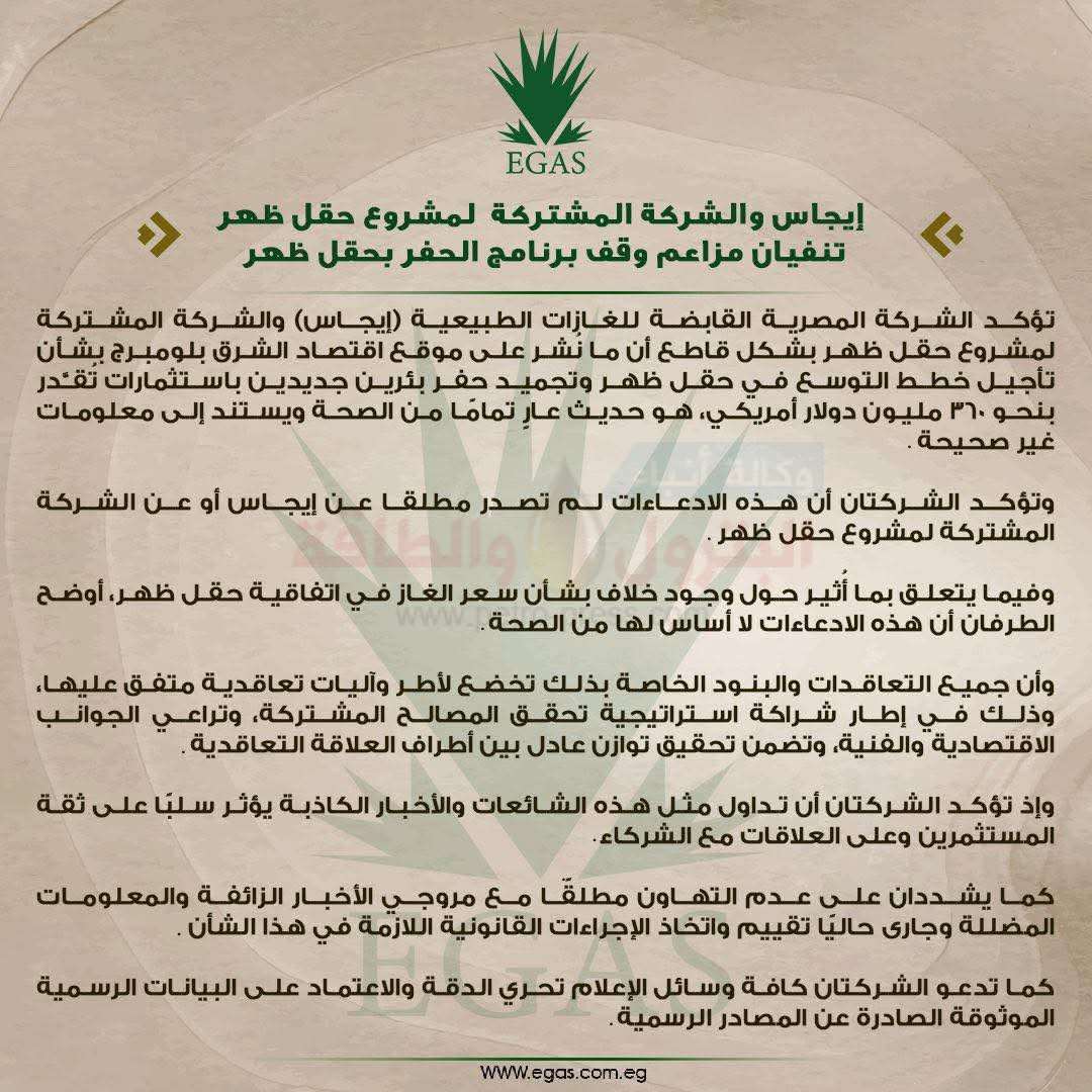 كتب رأفت إبراهيم…تؤكد الشركة المصرية القابضة للغازات الطبيعية (إيجاس) والشركة المشتركة لمشروع حقل ظهر بشكل قاطع أن ما نُشر على موقع اقتصاد الشرق بلومبرج بشأن تأجيل خطط التوسع في حقل ظهر وتجميد حفر بئرين جديدين باستثمارات تُقدر بنحو 360 مليون دولار أمريكي، هو حديث عارٍ تمامًا من الصحة ويستند إلى معلومات غير صحيحة.