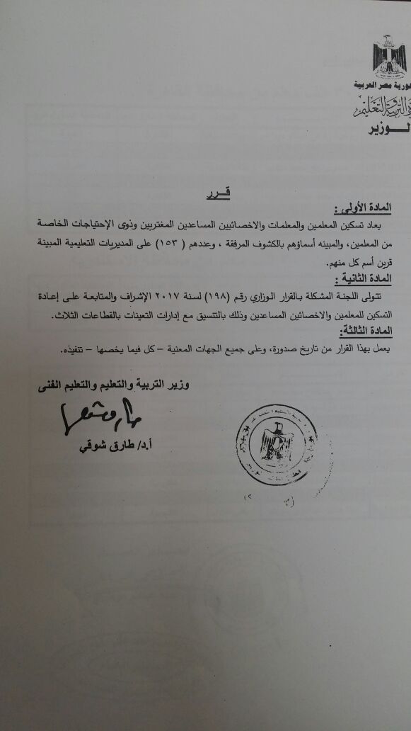 أصدر الدكتور طارق شوقى، وزير التربية والتعليم والتعليم الفنى، قرارا وزاريا رقم 324 لسنة 2017 بعودة 153 معلما مغتربا ضمن مسابقة الـ 30 ألف معلم من محافظة التسكين إلى محافظة الإقامة.