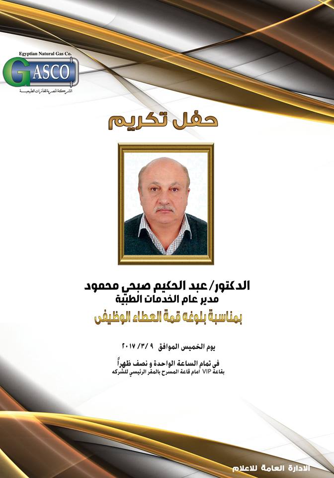 تقيم شركة جاسكو إحدى شركات قطاع البترول العملاقة ويرأس مجلس إداراتها المهندس كارم محمود، حفل تكريم للدكتور عبد الحكيم صبحى محمود مدير عام الخدمات الطبيه بالشركة وذلك بعد بلوغه سن المعاش