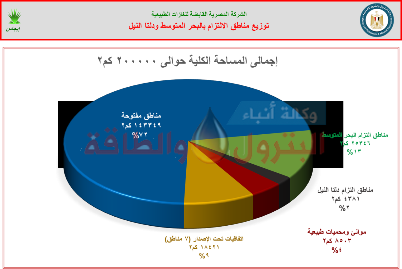 عدد 11 اتفاقية (8 مناطق بحرية بالبحر المتوسط و3 مناطق أرضية بدلتا النيل) موقعة مع الهيئة المصرية العامة للبترول وتحت الاشراف الفني للشركة المصرية القابضة للغازات الطبيعية