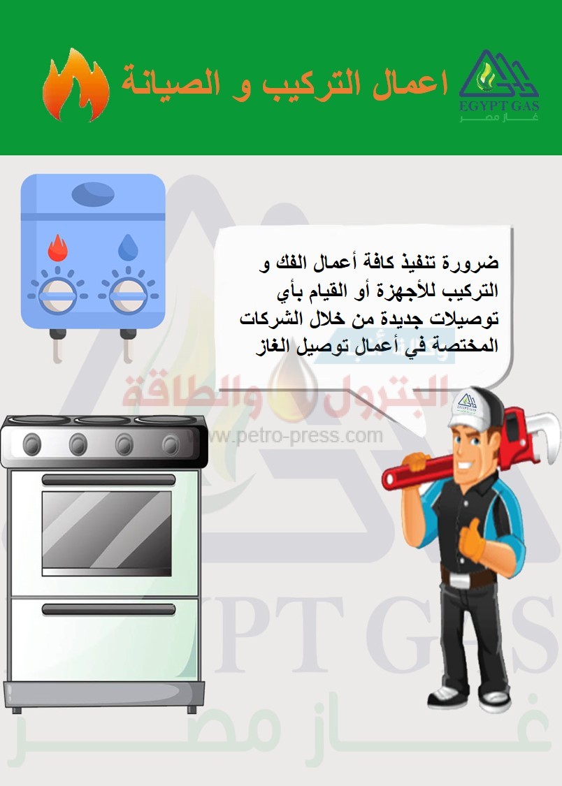 ضرورة تنفيذ كافة أعمال الفك و التركيب للأجهزة أو القيام بأي توصيلات جديدة من خلال الشركات المتخصصة في أعمال توصيل الغاز.