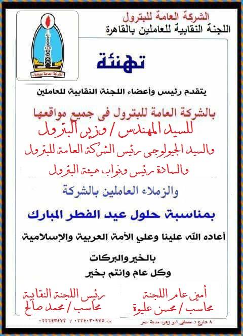 "نقابة العامة للبترول"تهنىء وزير البترول والعاملين بالشركة والقطاع بعيد الفطر