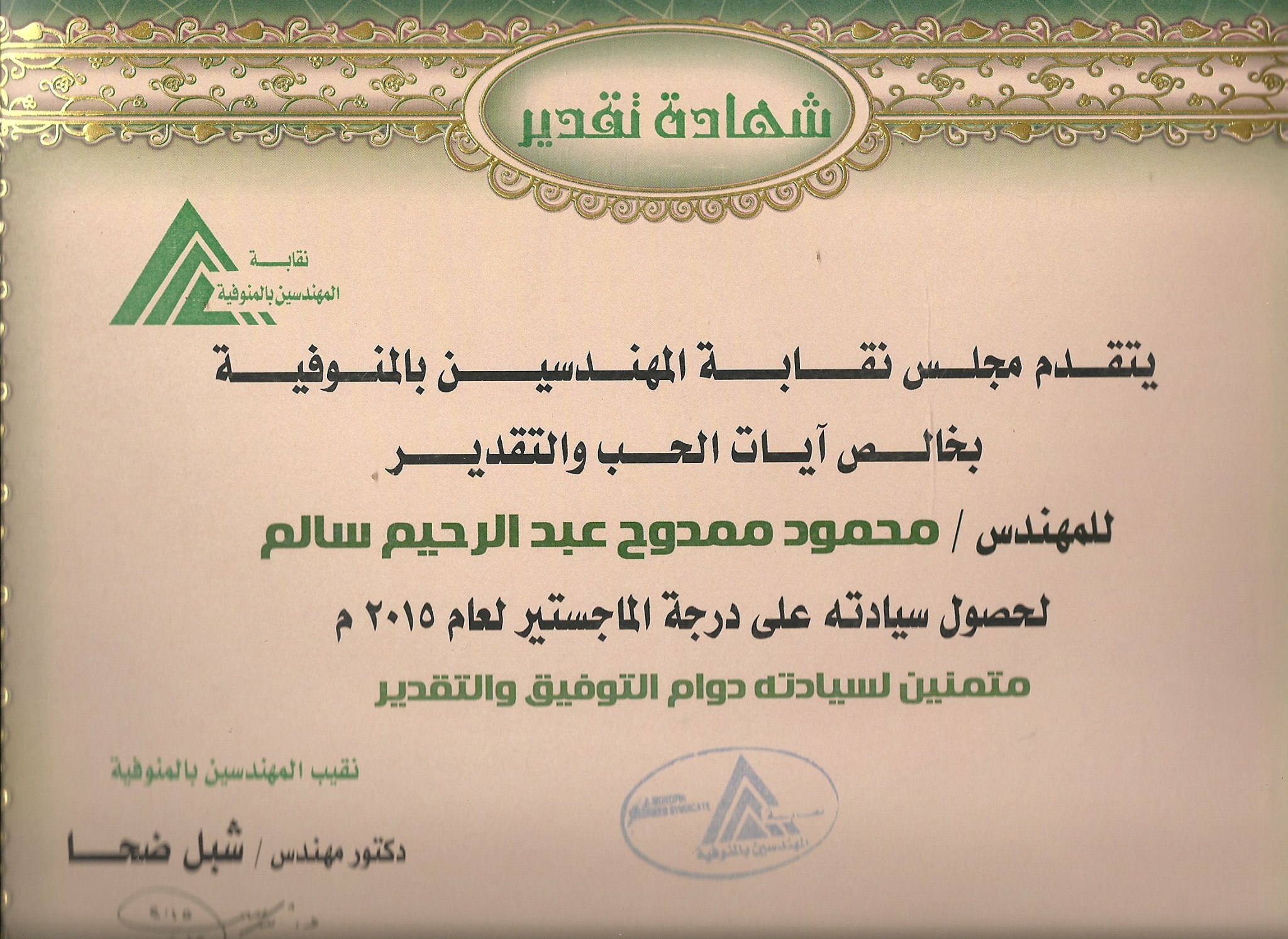 يواصل أبناء الشركة العامة للبترول تميزهم المهنى والعلمى، حيث حصل المهندس محمود سالم ، مهندس بالشركة العامة للبترول بحقول الصحراء الغربية، على الماجيستير أثناء الخدمة، بعنوان خواص وديمومة وتطبيقات أنواع مختلفة من الخرسانة المعاد تدويرها”.