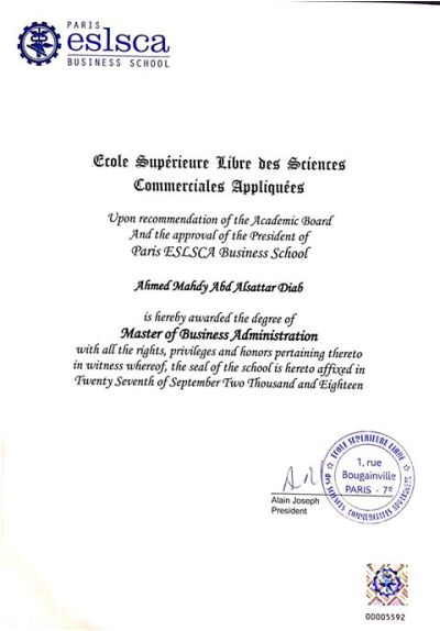 حصل المهندس احمد مهدى دياب رئيس قسم الكهرباء فى شركة السويس للزيت سوكو بموقع راس فنار، على حصولى على درجة الماجيستير فى العلوم الادارية من جامعة اسلسكا مصر.