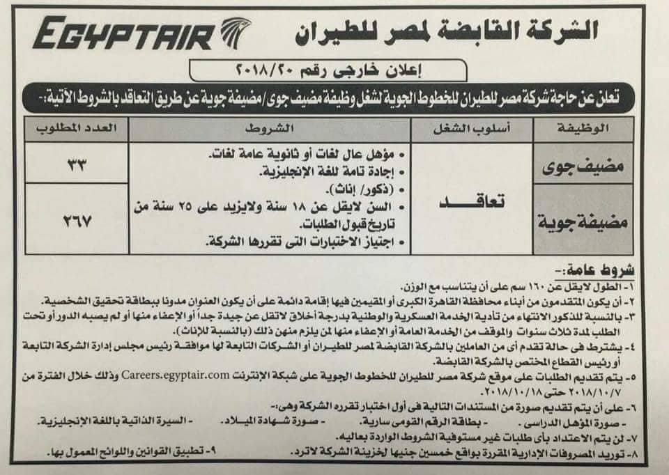 تنشر وكالة أنباء البترول ، اعلان وظائف شركة مصر للطيران رقم 20 لسنه 2018