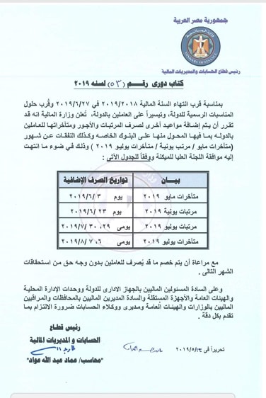 أعلنت وزارة المالية فى منشور كتاب دورى رقم 53 لسنة 2019 ، أنه بمناسبة قرب انتهاء السنة المالية 2018 /2019 فى 27 /6/2019، وقرب حلول المناسبات الرسمة للدولة وتيسيرا على  العاملين تعلن وزارة المالية أنه قد تقرر أضافة مواعيد جديدة لصرف المرتبات والأجور ومتأخراتها للعاملين بالدولة .