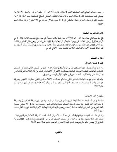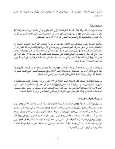 وذكرت شركة الطاقة أن مستحقاتها فى مصر بلغت 265 مليون دولار حتى 31 ديسمبر ارتفاعا من 221 مليون دولار في نهاية 2015. وبلغت مستحقات الشركة في إقليم كردستان العراق 713 مليون دولار انخفاضا من 727 مليون دولار في 2015.
