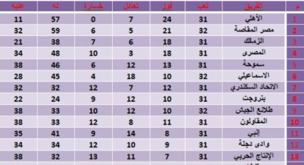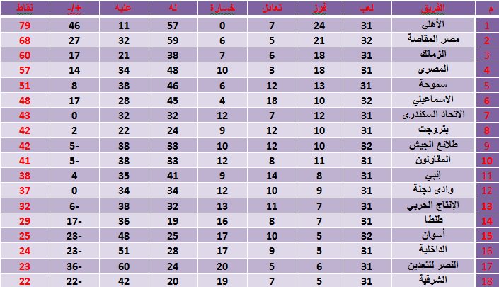 ننشر جدول ترتيب فرق الدوري المصري بعد مباريات الخميس 22 / 6 / 2017