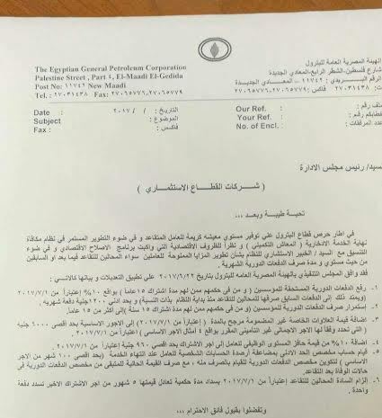 ننشر منشور تعديلات هيئة البترول بزيادة المعاش التكميلى للعاملين وإضافة قيمة العلاوات للأجور بحد أقصى 6000 جنيه