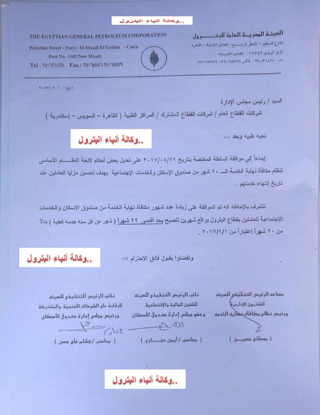 هيئة البترول تصدر منشور زيادة مكافئة شهور نهاية الخدمة من صندوق الاسكان للعاملين وترسلة للشركات