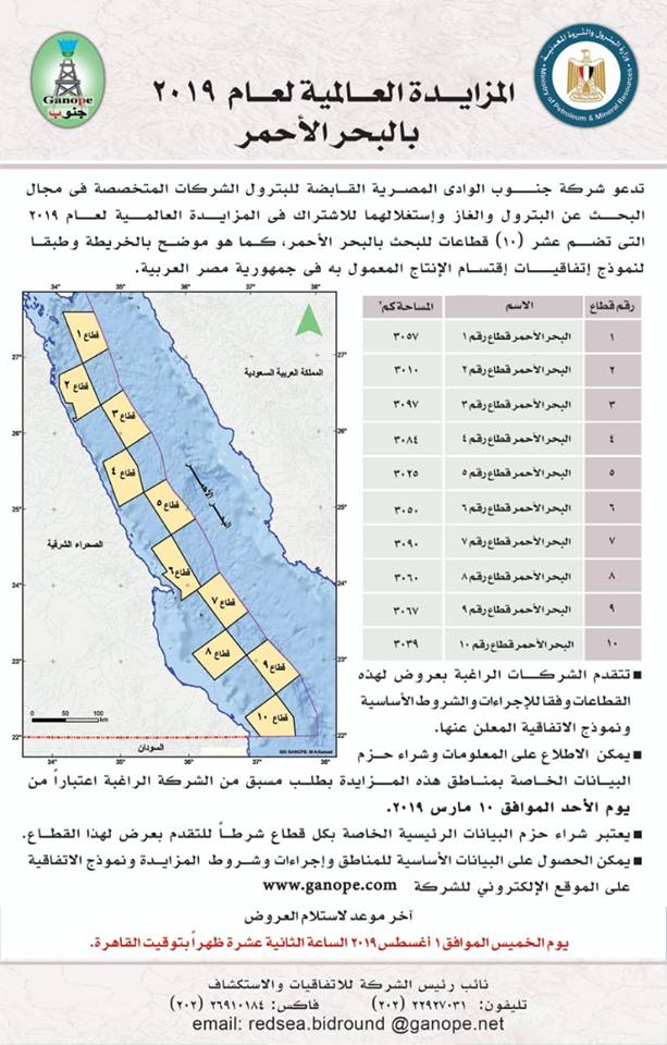 نشرت وزارة البترول والثروة المعدنية ، عبر موقعها الالكترونى ، بنر باللغة العربية والانجليزية عن مزايدة جنوب الوادى القابضة للبترول فى البحر الأحمر والتى تم الاعلان عنها مؤخرا فى 10 قطاعات فى اعقاب ترسيم الحدود مع المملكة العربية السعودية.